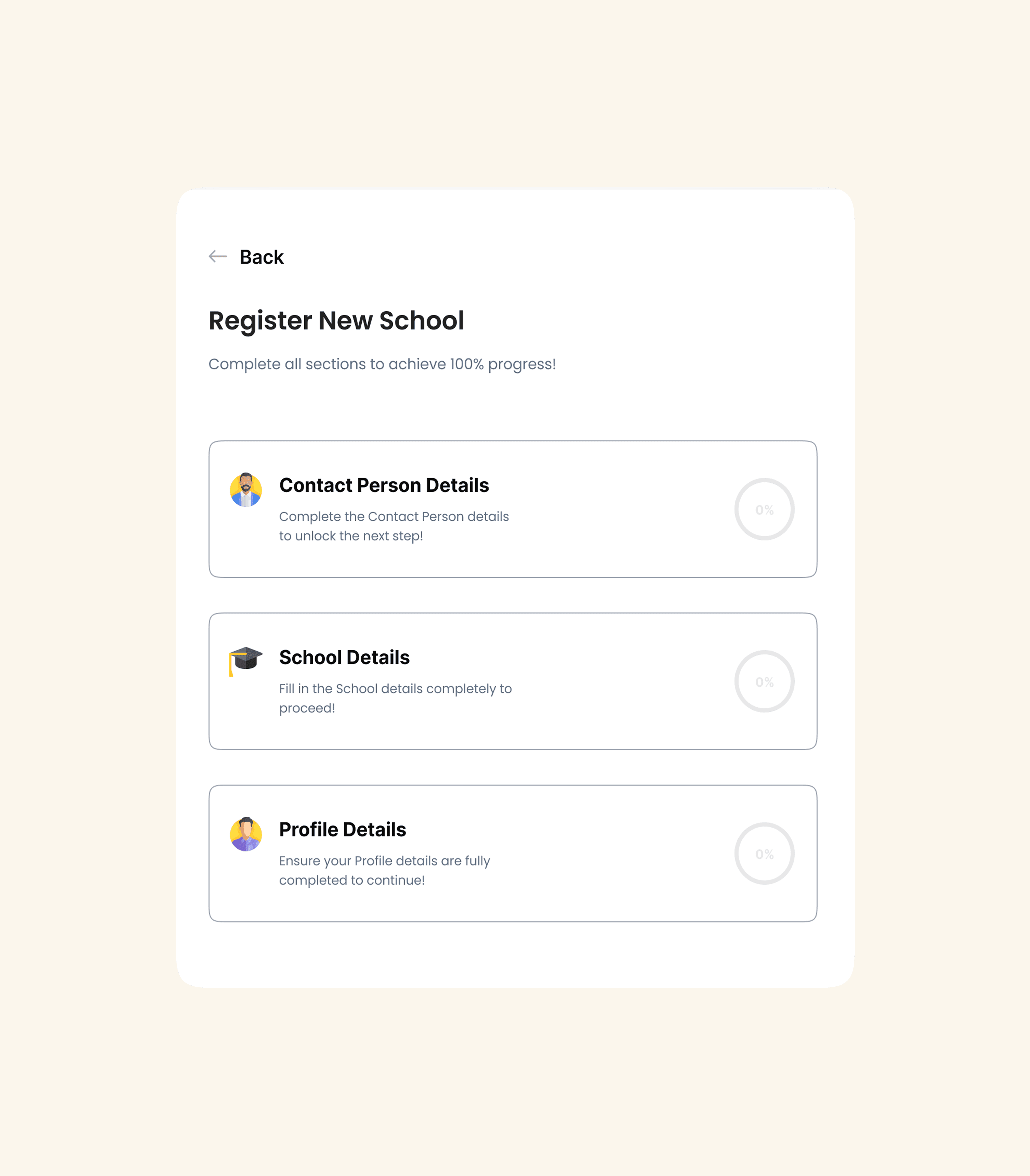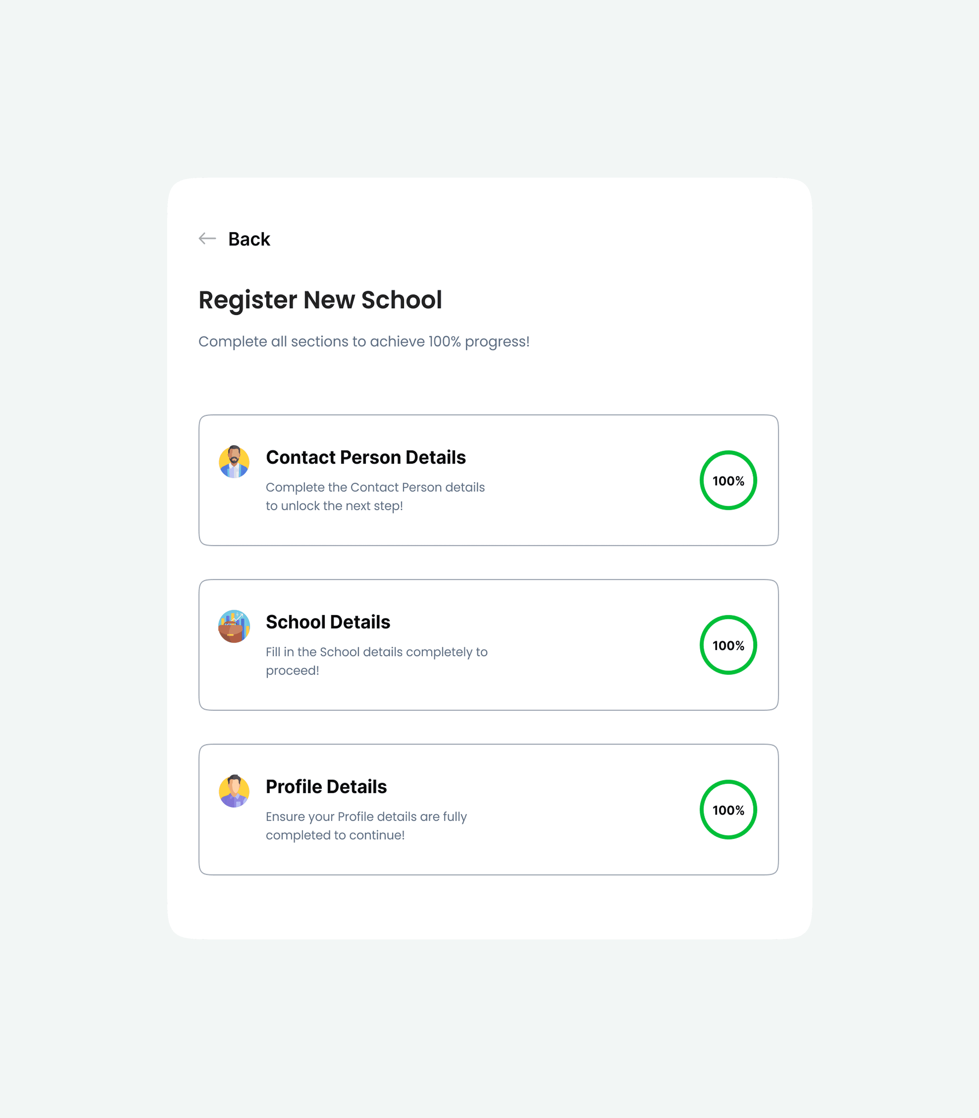 Provide accurate Contact Person, School, and Profile Details to complete your setup and achieve 100% registration progress.